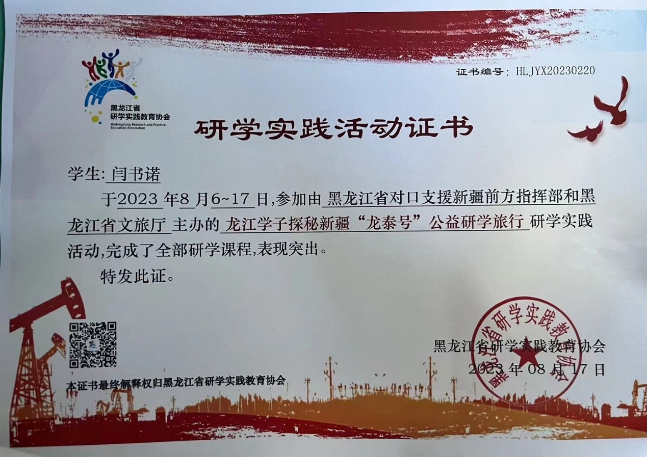 在今年8月,報名參加了黑龍江省對口支援新疆前方指揮部和黑龍江省文旅廳主辦的“探秘新疆公益研學(xué)旅行”,到可可托海紅色教育基地實地參觀“三號礦坑”,緬懷那些為國家奉獻出生命的前輩。