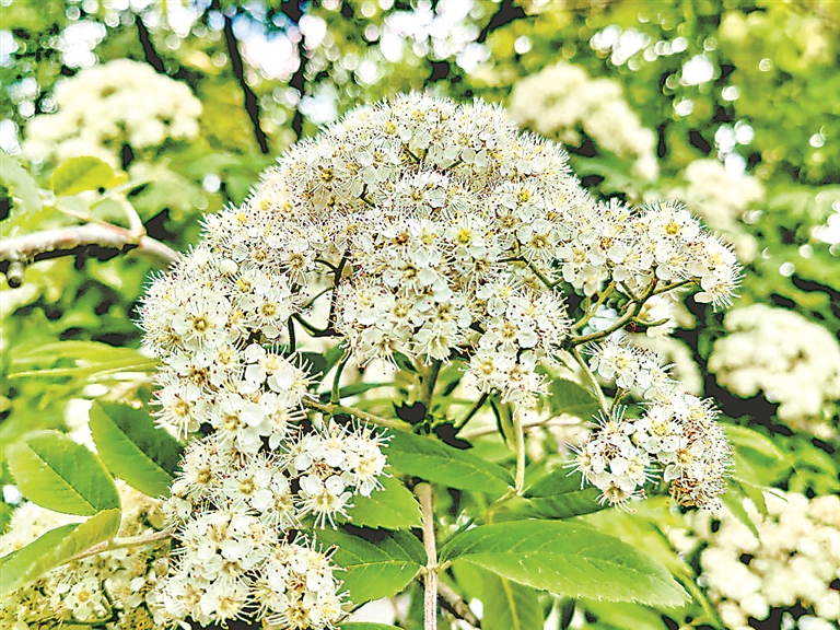 日前,哈爾濱市道里區(qū)松花江畔,四五棵花楸樹上,白色的花朵迎風綻放,非常美麗,吸引許多游人觀看、拍照。