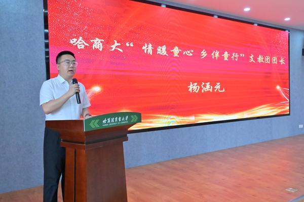 省希望工程捐助中心主任、省青少年發(fā)展基金會理事長杜晶為哈爾濱商業(yè)大學2024年“三下鄉(xiāng)”社會實踐團隊代表、“情暖童心·鄉(xiāng)伴童行”支教團代表授旗,希望即將奔赴龍江大地的志愿者們能夠充分利用服務期,向下扎根、向上生長,踐行志愿服務精神,在奉獻與收獲中積累報國為民的樸素情懷,做有理想、有擔當?shù)男聲r代青年。