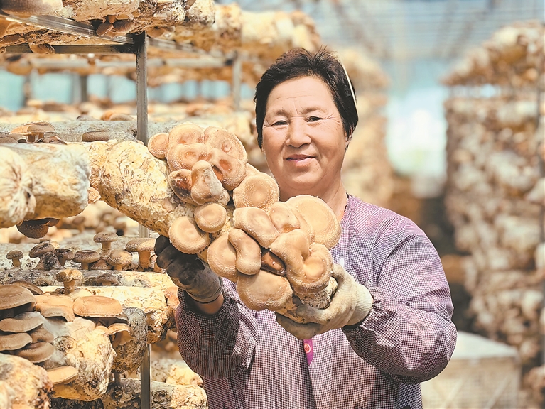 陽光透過棚室,溫?zé)岬目諝庵袕浡ü教赜械南銡?。一根根整齊擺放的菌棒上,淡褐色的花菇簇?fù)矶?,“傘面”花紋爆開,煥發(fā)著勃勃生機(jī)。“一棟高標(biāo)準(zhǔn)大棚放置一萬根菌棒,每年生長季可以采收六至七茬,一棟大棚至少收獲2萬斤花菇,按市場價(jià)7元一斤算,產(chǎn)值就是14萬元。”負(fù)責(zé)花菇生產(chǎn)技術(shù)管理的趙景龍說起花菇種植的“錢景”,一臉笑意。