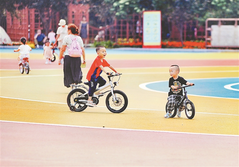 公園內(nèi)4000多平方米的休閑廣場(chǎng),經(jīng)過(guò)改造、彩化,呈現(xiàn)出全新的面貌,孩子們?cè)谏厦骝T車(chē)、奔跑。彩色廣場(chǎng)將工業(yè)主題元素融入設(shè)計(jì)理念,與周?chē)木坝^(guān)小品相得益彰。