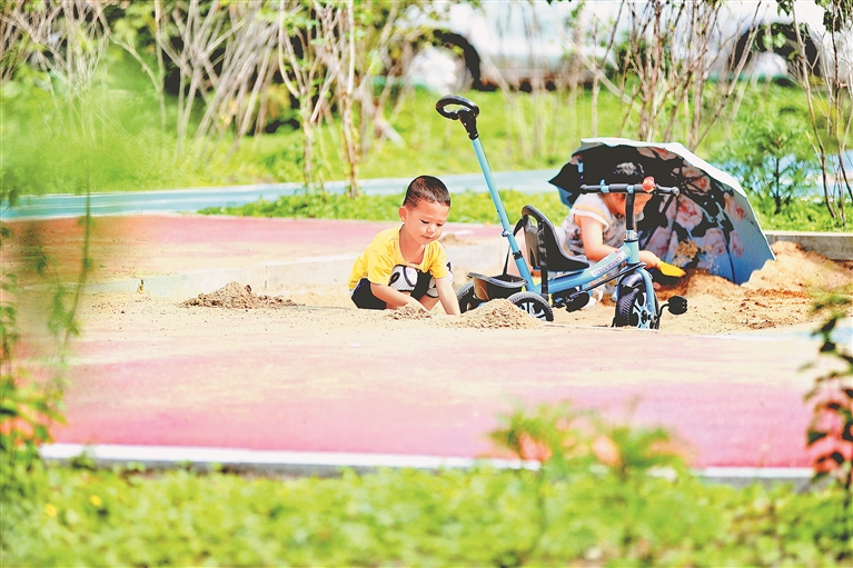 這處“口袋公園”占地面積數(shù)百平方米,里面有供人們散步聊天的休閑區(qū),有供孩子們玩樂(lè)的“微型沙灘”,花草樹(shù)木生長(zhǎng)茂盛,景色很美。