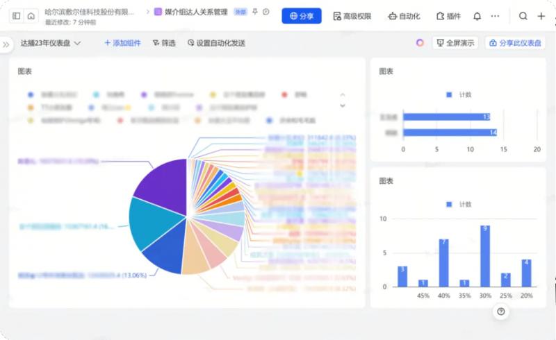 由于器械字號(hào)產(chǎn)品的特殊性,現(xiàn)在敷爾佳通過(guò)飛書(shū)在線文檔審批達(dá)人,將達(dá)人數(shù)據(jù)填寫(xiě)上報(bào),上級(jí)在線同步審批達(dá)人,跟進(jìn)確定合作。直播中,用飛書(shū)云盤(pán)儲(chǔ)存資料,將達(dá)播錄屏,產(chǎn)品資料等數(shù)據(jù),同步云盤(pán),方便各部門(mén)查看,調(diào)取相關(guān)資料。直播后,利用飛書(shū)多維表格將達(dá)人信息,合作傭金,產(chǎn)出 GMV,對(duì)接人等重要信息歸攏一起,形成多維表格方便組織內(nèi)互相查閱填寫(xiě), 通過(guò)儀表盤(pán)的功能體現(xiàn)出哪些達(dá)人是優(yōu)質(zhì)合作達(dá)人,并為二次投放合作提供了參考價(jià)值。
