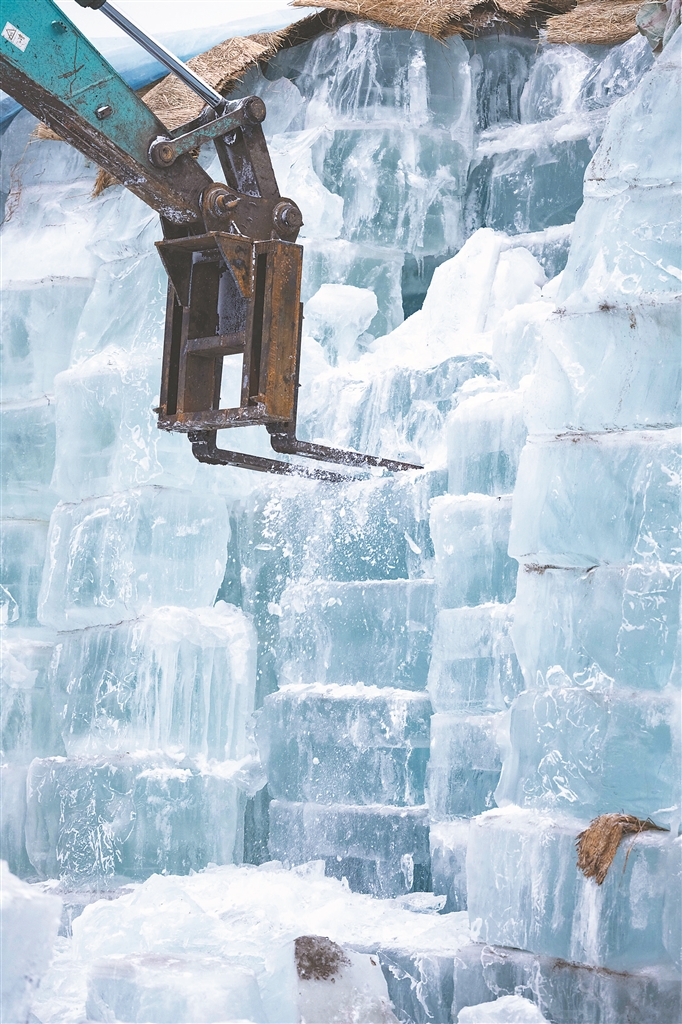 在哈爾濱冰雪大世界存冰場(chǎng),大量保存完好的冰體整齊堆疊,十分壯觀(guān)。冰垛之間,吊車(chē)、叉車(chē)、鏟車(chē)、卡車(chē)等穿行往返、有序作業(yè),一派熱火朝天的忙碌景象。