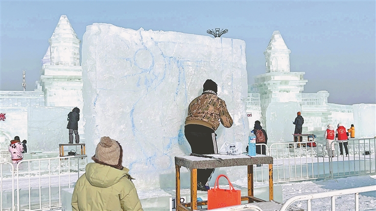 據(jù)了解,本屆冰雕比賽歷時3天,所有參賽作品將于1月4日雕刻結(jié)束,與游客見面。本報記者 馬智博攝
