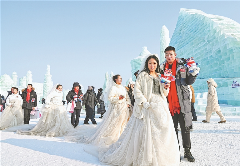 婚典儀式結(jié)束后,新人們乘坐哈爾濱冰雪大世界雪花摩天輪,俯瞰壯美的北國風(fēng)光,和游人一起賞冰玩雪、拍照留念。在太陽島雪博會,新人們欣賞雪雕藝術(shù)之美,在憨態(tài)可掬的《雪人先生》、氣勢磅礴的主塑《雪艷春》等雪雕前拍照留念,體驗(yàn)“走著走著就一起白頭”的人工降雪浪漫場景,在潔白冰雪筑起的美輪美奐童話世界中,感受哈爾濱冰雪文化的浪漫氛圍。