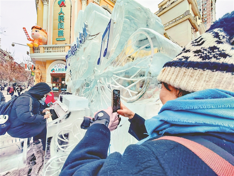 1月9日,哈爾濱市道里區(qū)中央大街和西九道街交口,一名游客在彈奏冰鋼琴。樂曲悠揚,飄蕩在百年老街的上空,人們紛紛上前圍觀拍照。