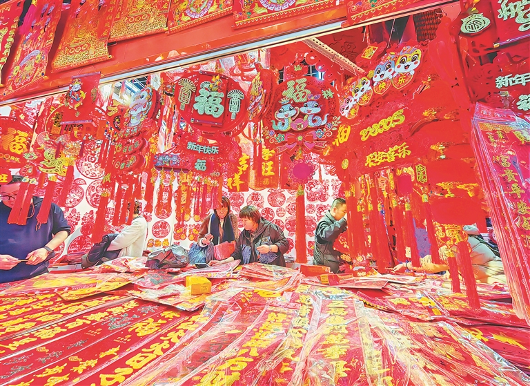 春節(jié)臨近,哈爾濱市道里區(qū)一處批發(fā)市場內(nèi),市民們正在購買各種節(jié)日飾品,用來裝點(diǎn)家居,迎接新春佳節(jié)的到來。蛇年主題的燈籠、對聯(lián)、福字等擺滿了柜臺,紅紅火火,喜慶氣氛濃厚。人們臉上都洋溢著幸福的笑容,一邊逛一邊買,個(gè)個(gè)滿載而歸。
