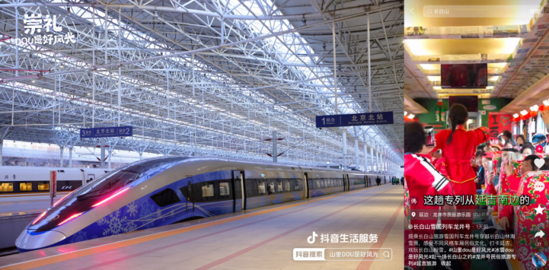 在線下,活動(dòng)還聯(lián)動(dòng)崇禮區(qū)政府、延邊州商務(wù)局、齊齊哈爾網(wǎng)信辦落地雪國專列,覆蓋復(fù)興號(hào)、民俗專列、高鐵站等不同場景,讓游客和市民感受濃濃冰雪氛圍,自發(fā)為當(dāng)?shù)匚穆梅N草,吸引更多雪友來到小城看見好風(fēng)光。截至活動(dòng)收官,“開往崇禮站的雪國專列”熱度達(dá)827萬,一度登上抖音河北多地同城榜TOP1。