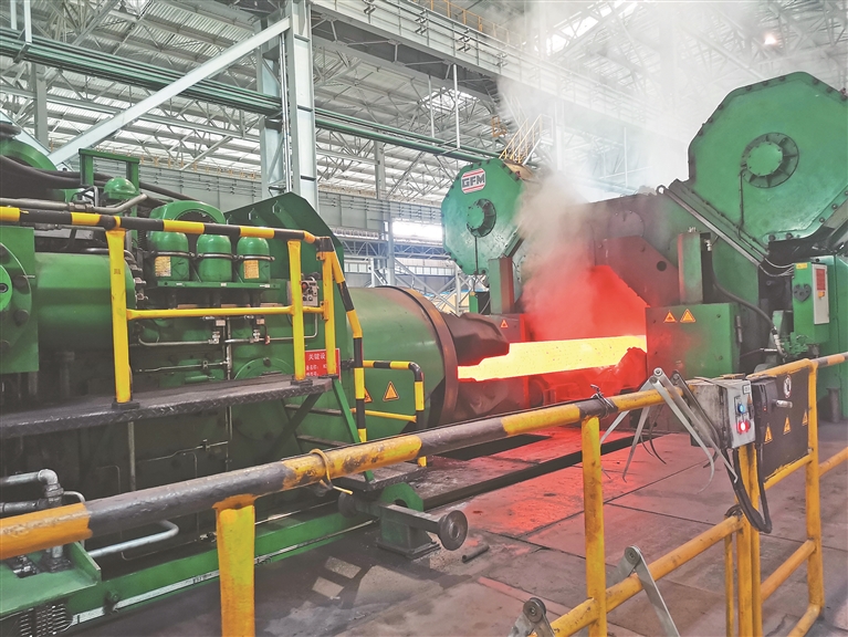 建龍北滿特鋼特冶鍛造廠鍛造作業(yè)區(qū)精鍛機(jī)正在鍛造鋼坯。本報(bào)記者吳玉璽攝