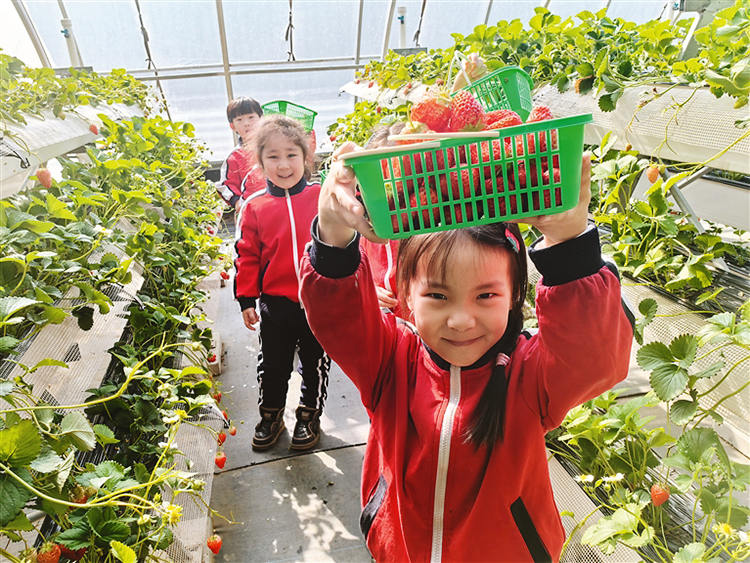 在位于陽明區(qū)樺林鎮(zhèn)的唐櫻園生態(tài)農(nóng)場(chǎng)里,整齊排列著24棟智能溫室大棚。在11號(hào)草莓大棚里,來自同心幼兒園的小朋友正在采摘草莓,孩子們興奮地圍著草莓觀察,“草莓真好看,草莓好甜??!”