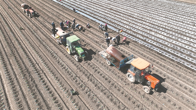 通往新華鄉(xiāng)的道路兩側(cè),儼然一幅動(dòng)態(tài)的農(nóng)事畫卷:拖拉機(jī)“突突”作響,拉著水罐在田壟間穿梭;菜農(nóng)們分工默契,有人鋪設(shè)地膜,白色薄膜在黑土地上延展成浪;有人彎腰移栽,鮮嫩菜苗被小心植入土中;有人手持水管緊隨其后,清水汩汩滋潤(rùn)著新苗。覆膜、栽苗、澆水,動(dòng)作連貫流暢,田埂間回蕩著農(nóng)具與泥土的碰撞聲,交織成初夏最生動(dòng)的勞作交響。