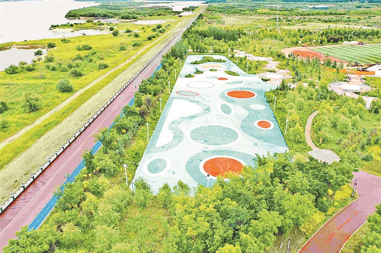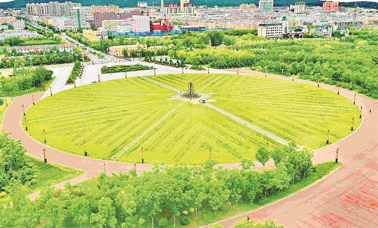 距離體育場不遠(yuǎn),有一處數(shù)千平方米的休閑廣場。廣場周邊新鋪了多條紅色慢行步道,是市民們散步休閑的好去處。在中心區(qū)域,工人們正建設(shè)雕塑,為中外游客打造一處美麗的打卡點。
