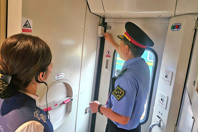 列車長(zhǎng)在對(duì)車門(mén)加鎖情況進(jìn)行檢查。(韓峰 攝)