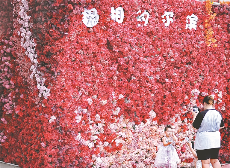 近日,哈爾濱市建筑藝術(shù)廣場(chǎng)上,游客們?cè)谛戮坝^前打卡拍照。這些景觀有彩繪墻壁,有花卉構(gòu)成的圖案,還有裝扮一新的商亭。它們構(gòu)思新穎,造型獨(dú)特,成為廣場(chǎng)上的新亮點(diǎn)。
