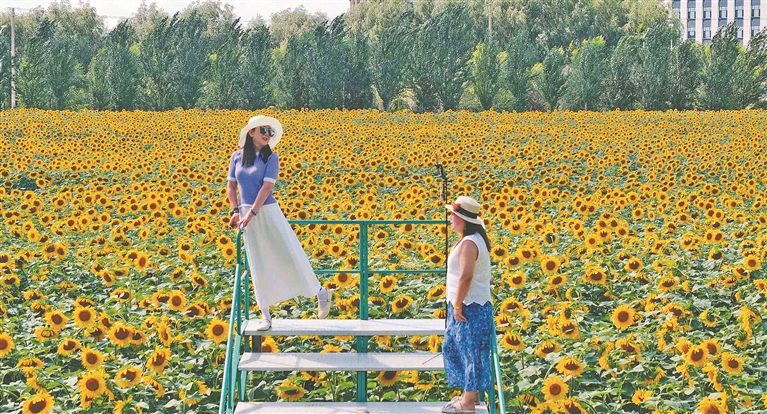 近日,哈爾濱市東方學院的校園里,30萬株向日葵進入盛花期,層層疊疊的金黃花瓣在校園里組成金色矩陣,連蜂蝶振翅都沾滿蜜糖色的光斑。風掠過時,葉片翻卷出翡翠色的浪涌,花盤碰撞發(fā)出細雨般的窸窣聲,空氣里浮動著類似烤面包的溫暖香氣?;êig的小橋上,愛花的市民在這里打卡拍照,定格最美瞬間。