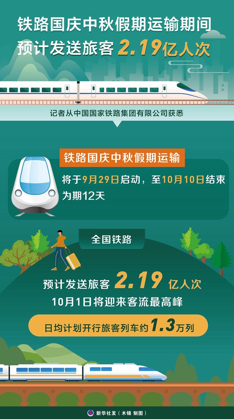 新華社北京9月28日電(記者樊曦)記者從中國國家鐵路集團有限公司獲悉,鐵路國慶中秋假期運輸將于9月29日啟動,至10月10日結(jié)束,為期12天,全國鐵路預計發(fā)送旅客2.19億人次,10月1日將迎來客流最高峰,日均計劃開行旅客列車約1.3萬列。