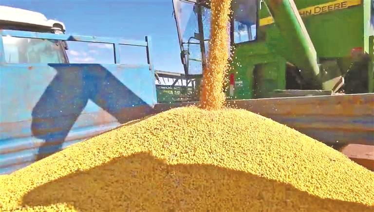 在海倫市前進(jìn)鎮(zhèn)雙泉村大豆農(nóng)業(yè)示范園區(qū),1510畝核心種植區(qū)宛如一塊碩大的金色地毯,格外引人注目。大型收割機(jī)轟鳴作業(yè),將飽滿的豆莢卷入機(jī)身,留下整齊的根茬,處處是忙碌的豐收景象。采訪中記者了解到,這里是全國大豆產(chǎn)業(yè)發(fā)展的“標(biāo)桿示范區(qū)”,該園區(qū)由軍琢農(nóng)機(jī)專業(yè)合作社負(fù)責(zé)種植經(jīng)營管理,海倫市農(nóng)業(yè)技術(shù)推廣中心的科技人員常年駐守田間,從種植方案制定,到田間技術(shù)培訓(xùn),再到生產(chǎn)過程中的實時指導(dǎo),全程為大豆種植“把脈護(hù)航”。