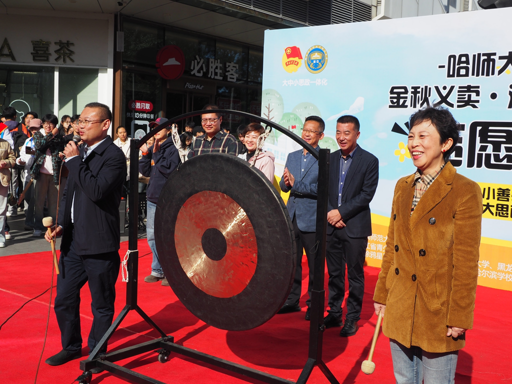 受贈方香坊區(qū)幸福鎮(zhèn)哈藥希望小學(xué)校長劉壯現(xiàn)場介紹了這所希望小學(xué)留守兒童的情況。開幕式最后,黃磊理事長和張靜萍書記一同敲響大鑼,鳴鑼開市。