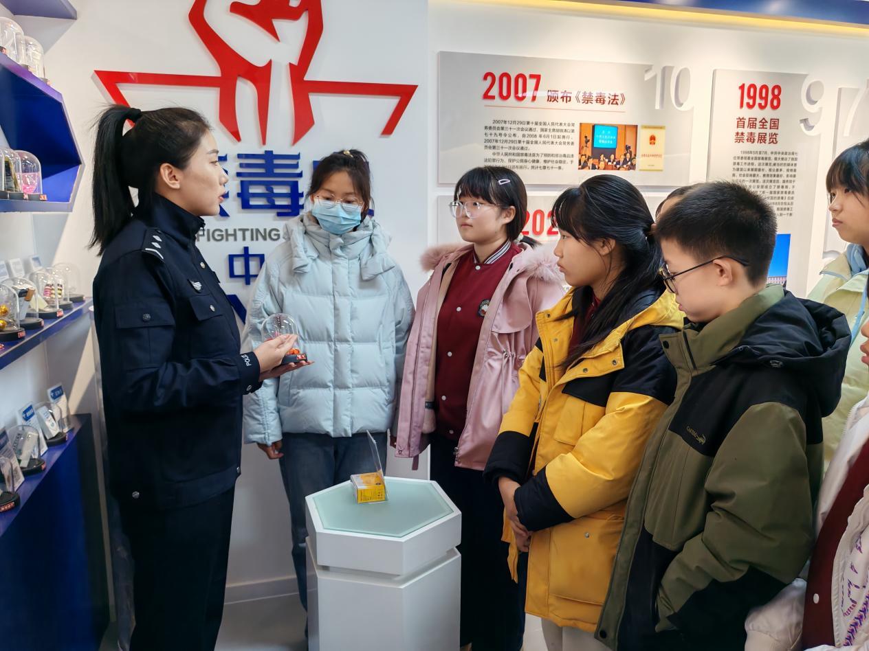 活動中,在基地講解員的引導下,師生們在中國禁毒史展區(qū),虎門銷煙的歷史場景、近代禁毒斗爭通過圖文形式生動呈現(xiàn),講解員講述的禁毒先輩故事,讓師生們深刻感悟到禁毒工作的歷史厚重與現(xiàn)實意義。在仿真毒品展示區(qū),講解員詳細介紹了傳統(tǒng)毒品、合成毒品及新型毒品的種類、特性與識別技巧,破解了“看似無害實則致命”的毒魔偽裝,幫助師生們練就辨別毒品的“火眼金睛”。