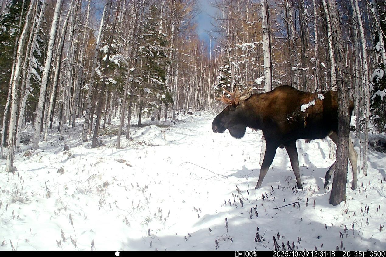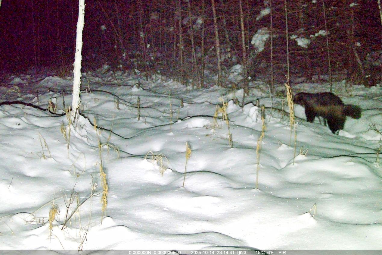 項目實施中,工作人員克服地形復雜、嚴寒天氣等挑戰(zhàn),深入森林公園腹地完成15條冬季樣線調(diào)查,并同步開展97臺紅外相機的維護與回收工作,累計獲取了大量珍貴野生動物影像資料及活動數(shù)據(jù)。監(jiān)測范圍內(nèi),駝鹿、原麝、貂熊、紫貂、猞猁、棕熊、馬鹿、花尾榛雞等國家重點保護野生動物相繼現(xiàn)身,更捕捉到原麝覓食、棕熊帶崽等罕見畫面,直觀印證了森林公園內(nèi)棲息地質(zhì)量優(yōu)良、生態(tài)保護成效顯著。