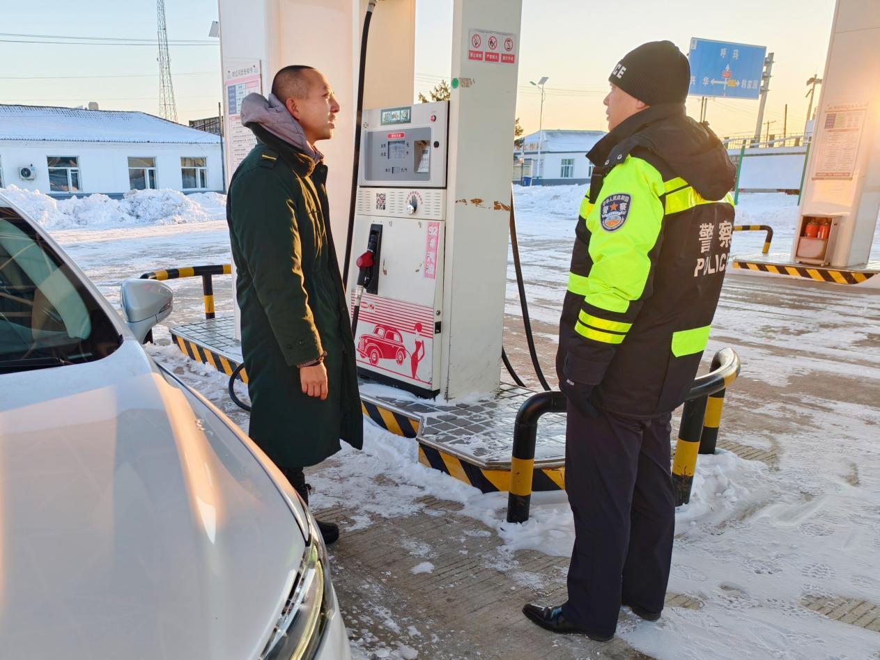 簡單確認(rèn)情況后,民輔警立即攜帶救援物資,前往事發(fā)地點(diǎn),在最短時間內(nèi)找到報(bào)警人。在詢問車內(nèi)油量大約能達(dá)到最近的加油站后,警車引領(lǐng)報(bào)警人駕駛車輛抵達(dá)最近的加油站,加滿油后囑咐駕駛員雪天路滑,注意行駛速度,切勿疲勞駕駛。
