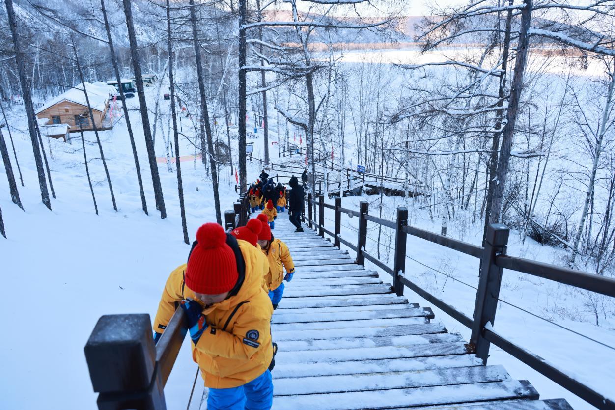 孩子們排成一串靈動的小隊,踩著積雪在棧道上噠噠前行,腳下“咯吱咯吱”的清脆聲響,為這場研學之旅奏響歡快序曲。軟糯的廣西口音此起彼伏,孩子們或好奇地觸摸棧道積雪,冰涼的觸感讓他們瞇起眼睛直跺腳;或緊緊抓著欄桿,任憑小臉凍得通紅,仍目不轉(zhuǎn)睛眺望遠方“Ω”形的冰封江灣,沉浸式感受北國冰雪的奇妙。那一抹抹跳動的橘色,在純白世界中宛如一團團小火苗,格外耀眼。