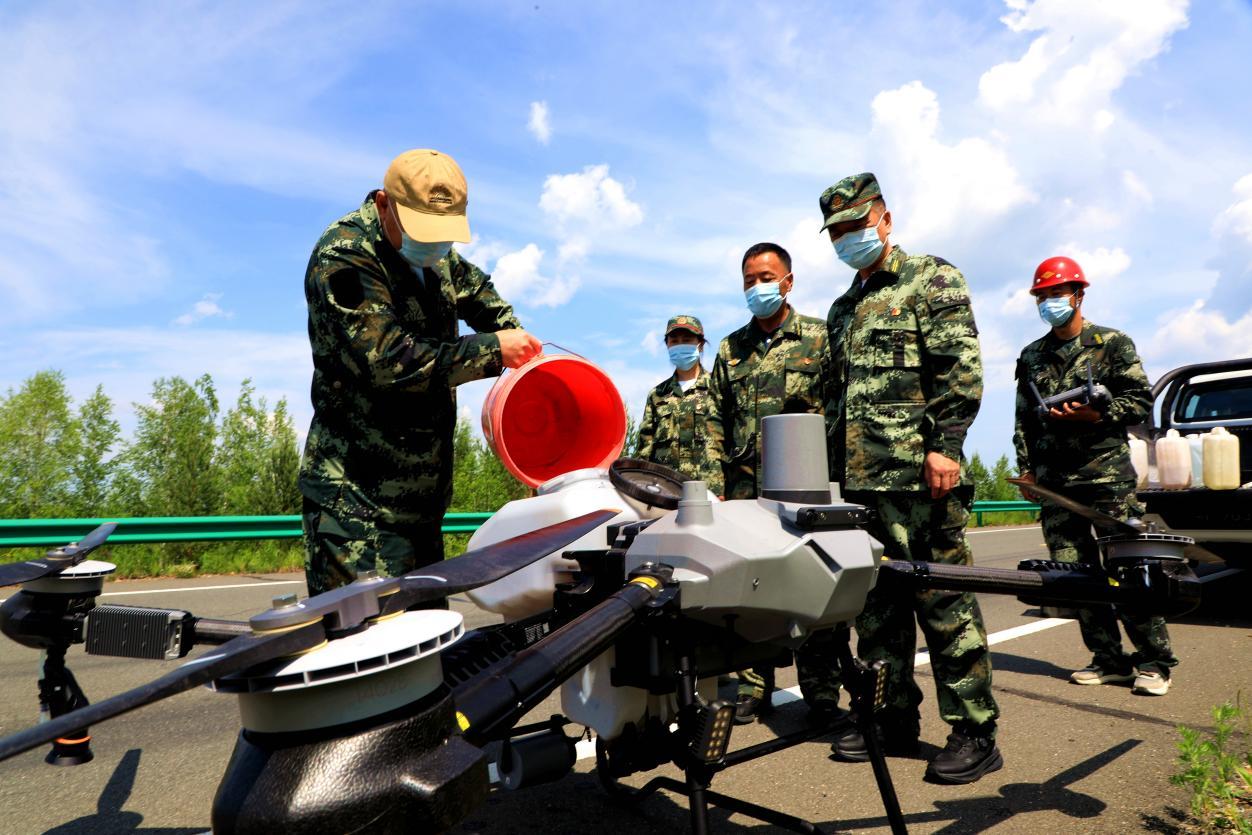 阿木爾林業(yè)局林防站工作人員為無人機(jī)添加防治藥液,防治樟子松梢斑螟(王力 攝)