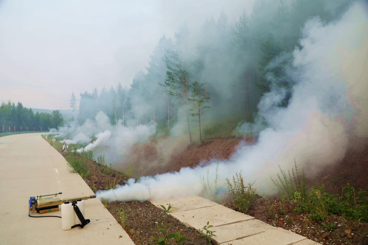 阿木爾林業(yè)局林防站聯(lián)合相關(guān)林場(chǎng),點(diǎn)燃“百菌清”煙劑,防治“早落病”效果(王力 攝)