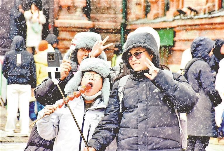 17日,正月初一。哈爾濱市迎來了降雪天氣。樹上、車上、建筑上、道路上都落了一層白雪,為節(jié)日里的冰城增添了更多魅力。在各處景點(diǎn),市民和游客在雪中拍照、玩耍,盡享降雪帶來的快樂。