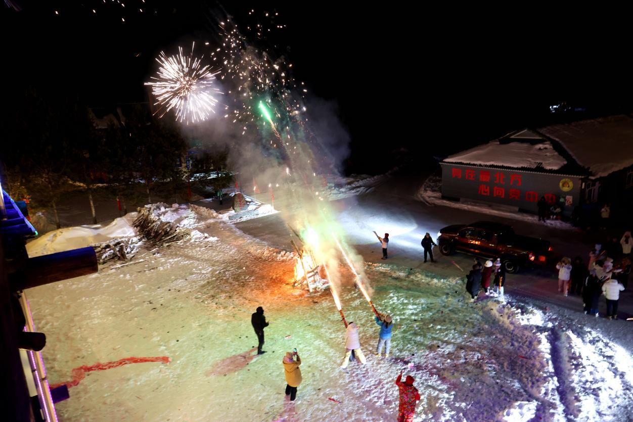 夜幕降臨,龍河驛站燈火璀璨。游客們圍站在一起,揉面團、搟面皮、包餃子,歡聲笑語不斷。熱氣騰騰的團圓飯上桌,大家舉杯同慶高歌,共賀新春。篝火點燃,煙花綻放,清脆的鞭炮聲響徹雪野,大人孩子盡情歡跳、嬉戲,雪地成了歡樂的海洋,笑聲、歡呼聲與冰雪美景相融,繪就一幅溫暖喜慶的新春畫卷。