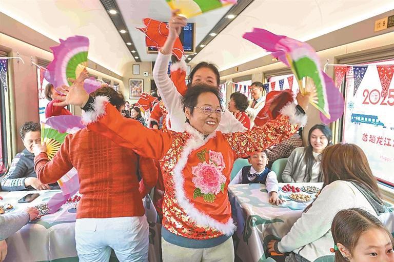 2月5日18時(shí)20分,K7041次“東北大花”主題列車(chē)從哈爾濱站緩緩駛出,一路向北,駛向漠河。車(chē)廂內(nèi),來(lái)自大興安嶺的鄂倫春族非遺代表性傳承人,現(xiàn)場(chǎng)展示用樺樹(shù)皮制作的手工藝品,列車(chē)工作人員身著民俗服飾帶領(lǐng)游客剪窗花,東北秧歌、二人轉(zhuǎn)表演更是點(diǎn)燃了旅途熱情。