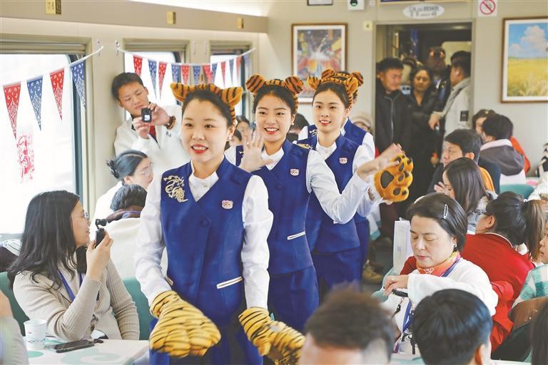 工作人員在旅游列車(chē)上表演“萌虎韻律操”。邢玉博攝