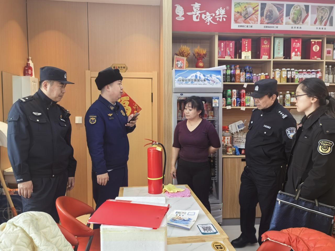 檢查組在消防器材銷售門店核對(duì)產(chǎn)品外觀標(biāo)識(shí)、構(gòu)件、廠家資質(zhì)等檢查和判定(胡春磊 攝)