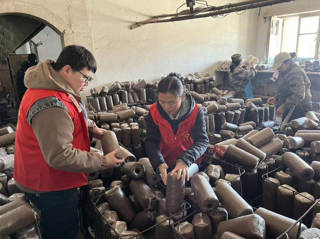 林場志愿者在木耳種植大棚支援菌筐轉(zhuǎn)運工作(趙可心 攝)